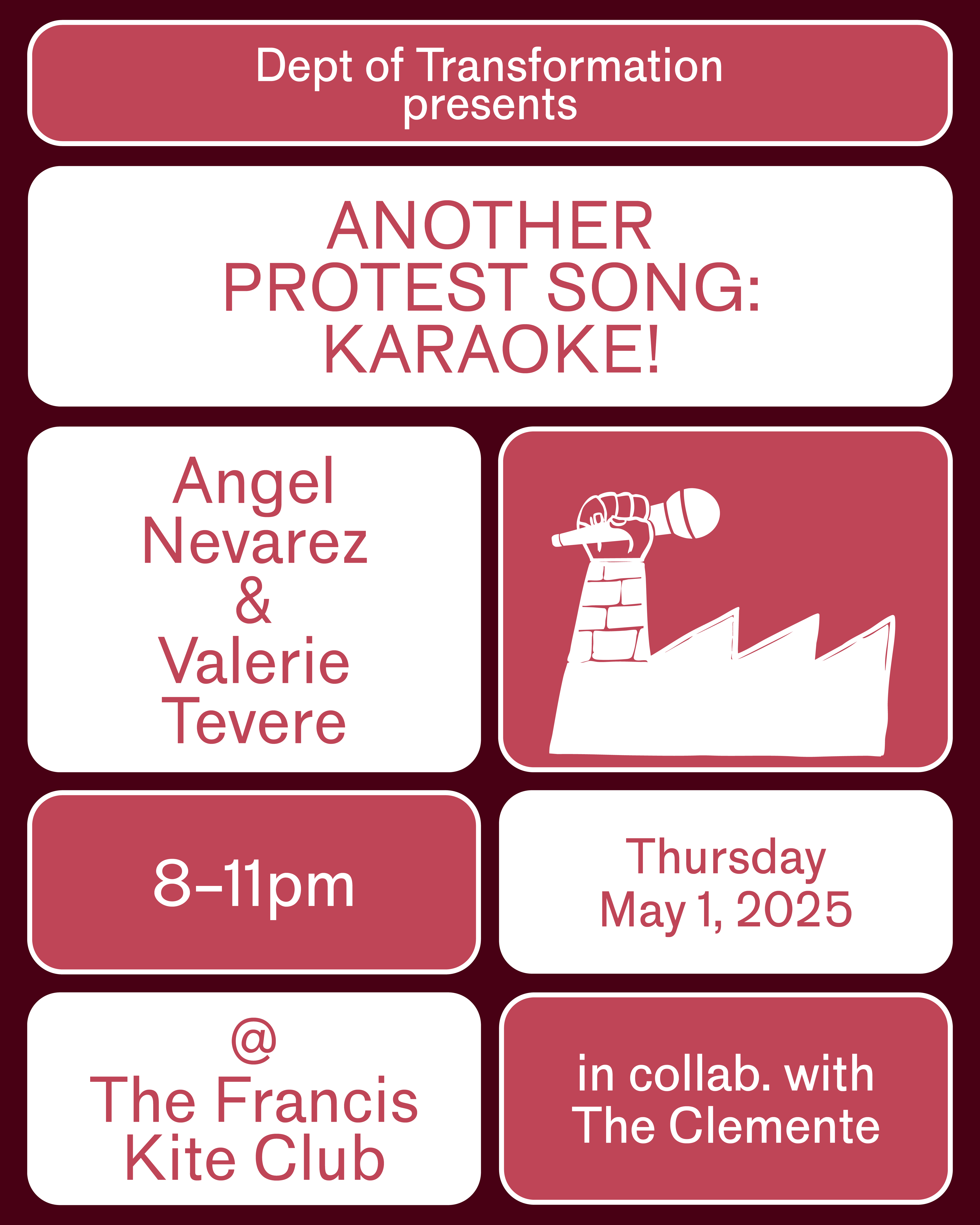 Department of Transformation (DOT) and The Clemente are thrilled to announce our next Karaoke Practice! at The Francis Kite Club on May 1, 2025. In this ongoing series of experimental and participatory gatherings, collective voice, performance, and transformation take center stage.