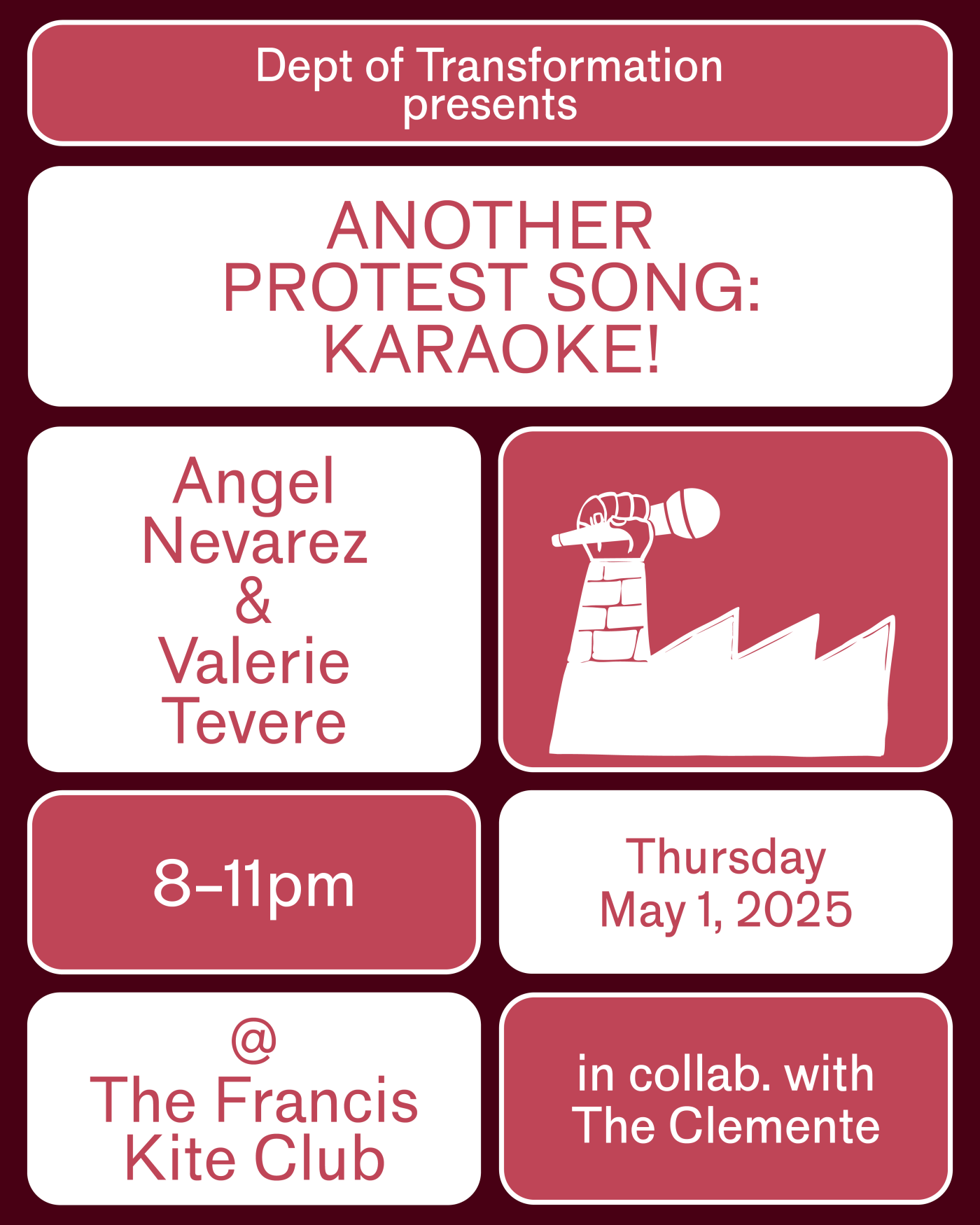 Department of Transformation and Karaoke Practice! are supported by The Clemente Soto Velez Cultural & Educational Center.